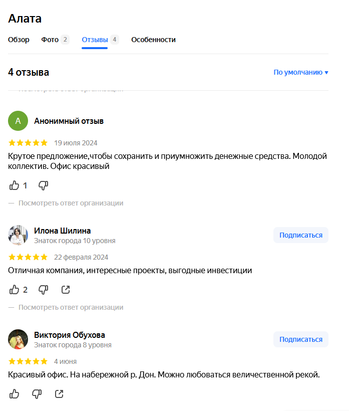 - в основном положительные отзывы компании Алата от инвесторов, сотрудников и конечных потребителей (касаемо Алата Групп в Ростове-на-Дону).