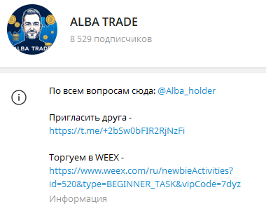 ALBA TRADE — максимально сомнительный канал в Telegram. На независимых сайтах о нем почти нет информации, только негативные обзоры. Автор зарабатывает на партнерке сомнительной биржи, которая обманывает клиентов.