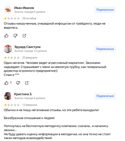 Другие пользователи утверждают, что после оформления заявки на бесплатное обучение их замучили звонками, но такой агрессивный маркетинг вызывает только раздражение. Из-за подобных комментариев репутацию проекта все же стоит больше отнести к негативной, так как доказательств реальных успехов в трейдинге с Александром Александровичем Ереминым нет.