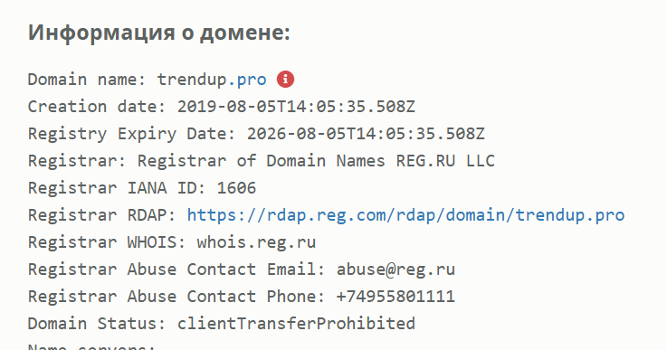 На сайте TrendUp pro написано про девять лет на рынке, но это никак не подтверждается, а проверка домена показала дату регистрации 05.08.2019, причем другое имя вообще появилось только в 2022 году.