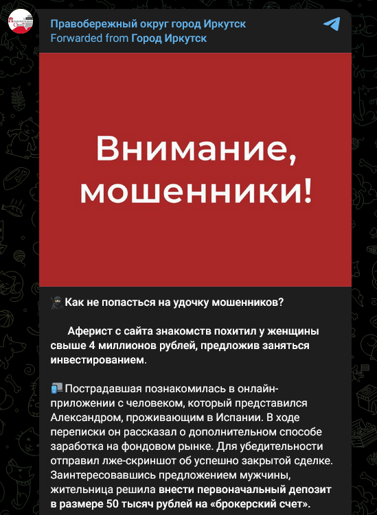 Данный вид скама давно используют недобросовестными юзерами, недавно он всплыл вновь в Иркутске. Об этом сообщили в местном Телеграм-канале «Правобережный округ».