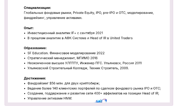 Сомнительно, что человек с менее чем годом опыта в трейдинге может эффективно управлять портфелем и проводить IPO. Связь с SF Education не гарантирует профессионализма. Рискованно доверять средства такому специалисту.