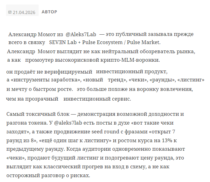 Мы проверили работу инвестора Александра Момотова, рекламирующего сервис для заработка, и пришли к выводу, что Алекс занимается вовлечением людей в лохотрон. Мы не можем рекомендовать пользователям взаимодействие с мошенником Aleks7Lab и финансовой пирамидой «СевенЛаб».