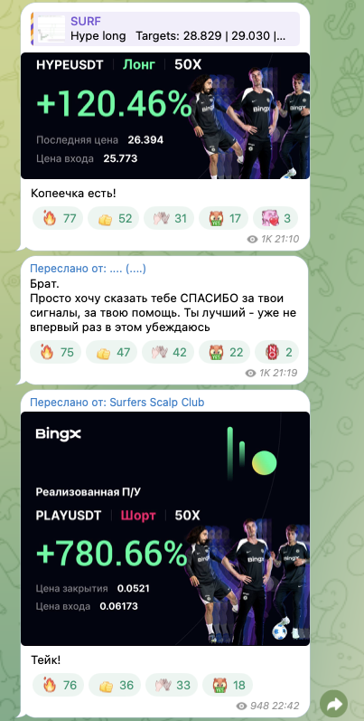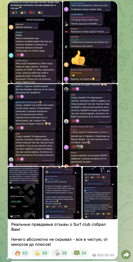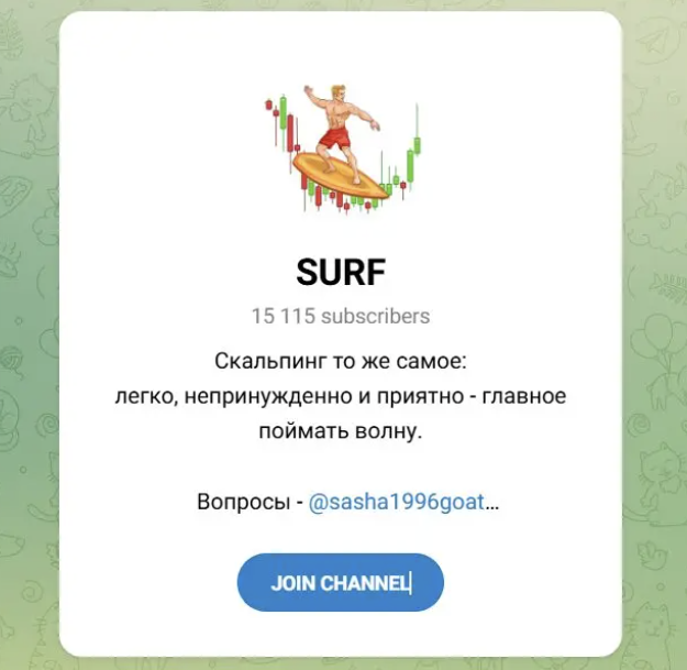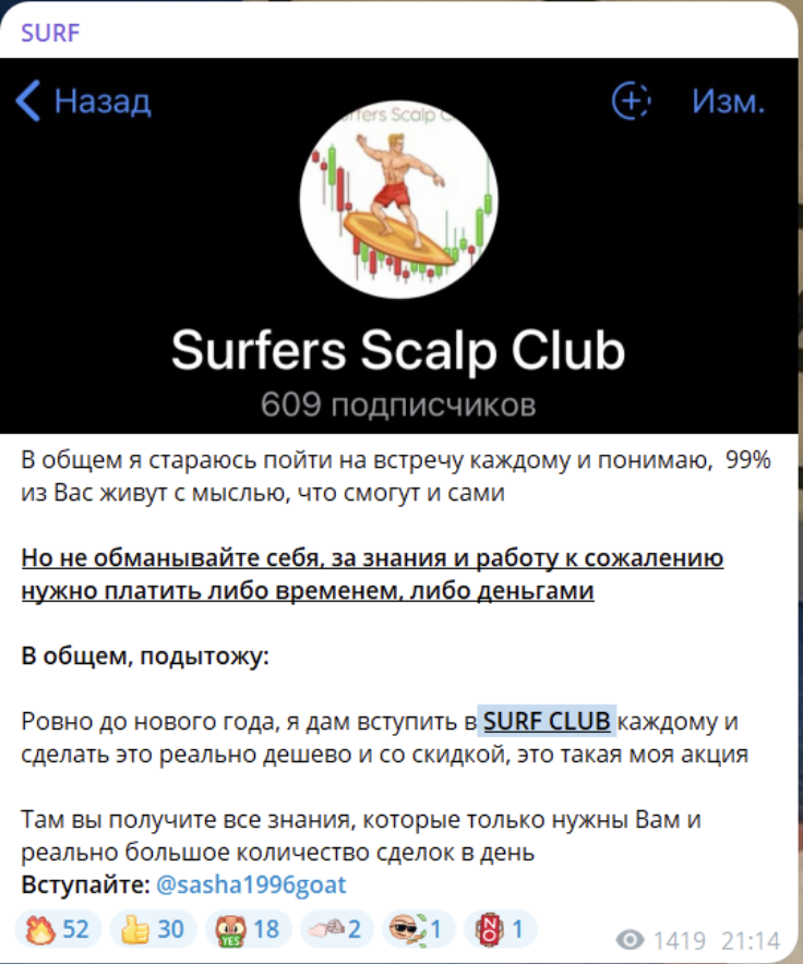 Александр предлагает вступать в его платный закрытый клуб Surfers Scalp Club. Информацию о стоимости подписки на приватку организатор проекта не раскрывает, но регулярно отмечает, что готов предоставить скидку.