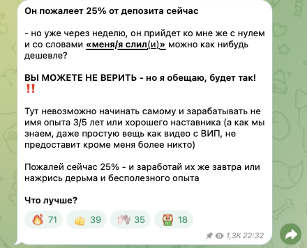 На неподконтрольных организатору проекта ресурсах фидбэка о нем нет. Это дополнительное доказательство тому, что аудитория его ТГК агрессивно накручена. В противном же случае трейдера активно обсуждали бы на форумах, финансовых сайтах, в тематических группах в соцсетях и т.п.