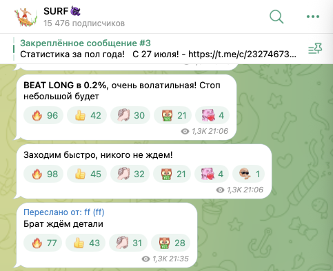 На 30 декабря 2025-го года на телеграмм-канал SURF подписаны 15,5 тысяч юзеров. Публикации на канале собирают в среднем по 1,2-1,4 тысячи показов, что составляет менее 10% от номинальной аудитории.