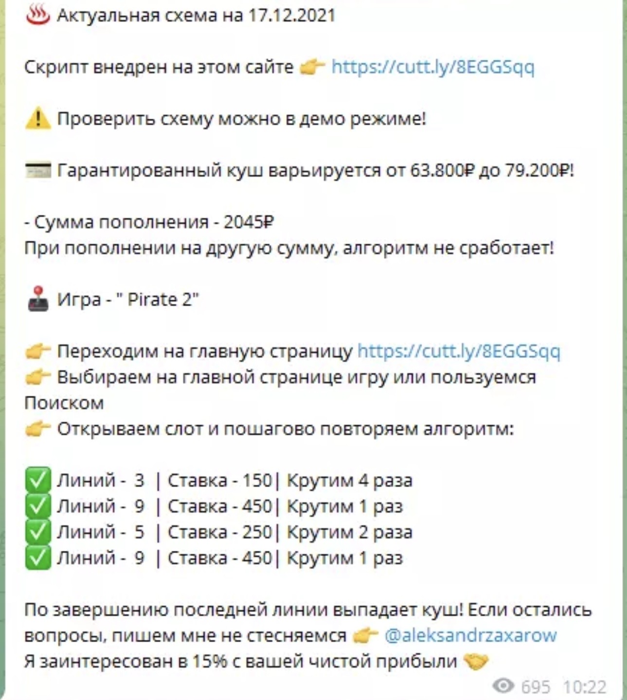 В своем Телеграмм паблике Александр Захаров рассказывает о себе как о программисте, который уже заработал солидный капитал и создал программу, способную автоматически извлекать доход из сделок на финансовом рынке.