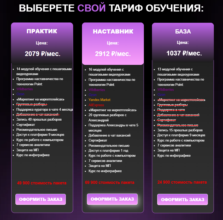 Этот так называемый курс «МультиМаркетплейсер» от Александры Чечетовой — просто очередная ловушка для доверчивых людей. Обещания зарабатывать 3 тысячи рублей в час звучат как насмешка над здравым смыслом. Тарифы заоблачные, а содержание модулей расплывчатое и без конкретики. Где доказательства успехов учеников? Вместо этого мы видим только тщательно отобранные положительные отзывы, а негативные комментарии оперативно удаляются. Отсутствие образовательной лицензии и отказ от возврата денег говорят сами за себя. Не дайте себя обмануть!