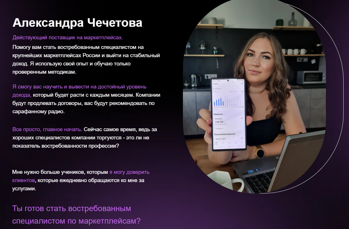 Сама Александра является якобы действующим поставщиком на крупнейших маркетплейсах, обещает поделиться своим опытом и накопленными знаниями. Утверждается, что для старта заработка не нужны специальные знания, начать получать прибыль можно с нуля.