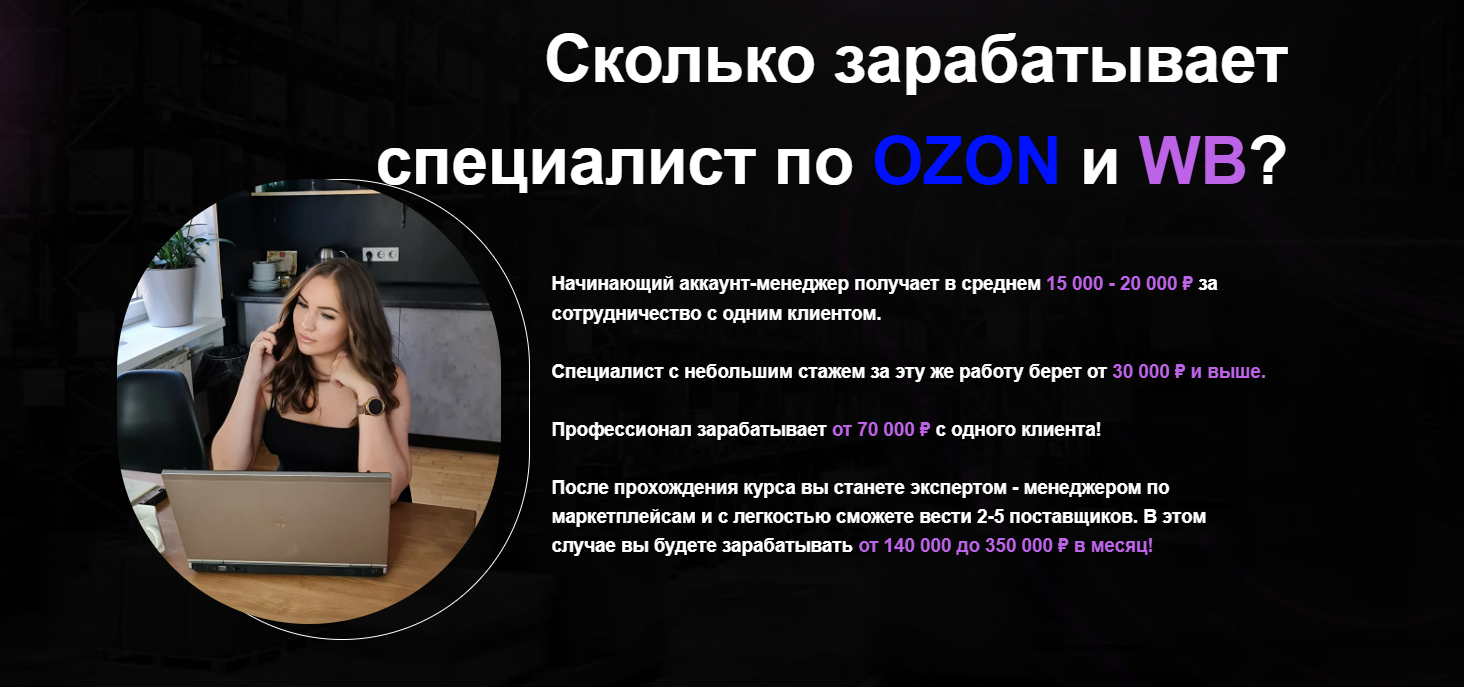 Для убедительности менеджер маркетплейсов Александра Чечетова приводит в пример актуальные вакансии и размер заработных плат для начинающих аккаунт-менеджеров, специалистов с небольшим опытом и профессионалов. Утверждается, что «потолок» вознаграждения составляет ₽70,000, но только не в случае с авторским курсом. После его прохождения якобы легко стать настоящим экспертом и с легкостью вести от двух до пяти поставщиков, а это ₽140,000–₽350,000 в месяц.