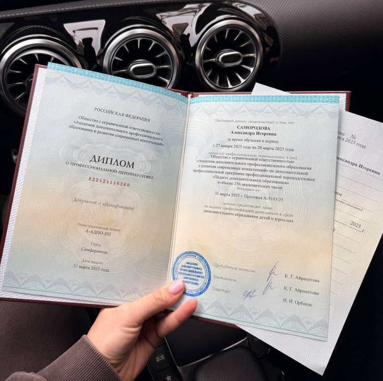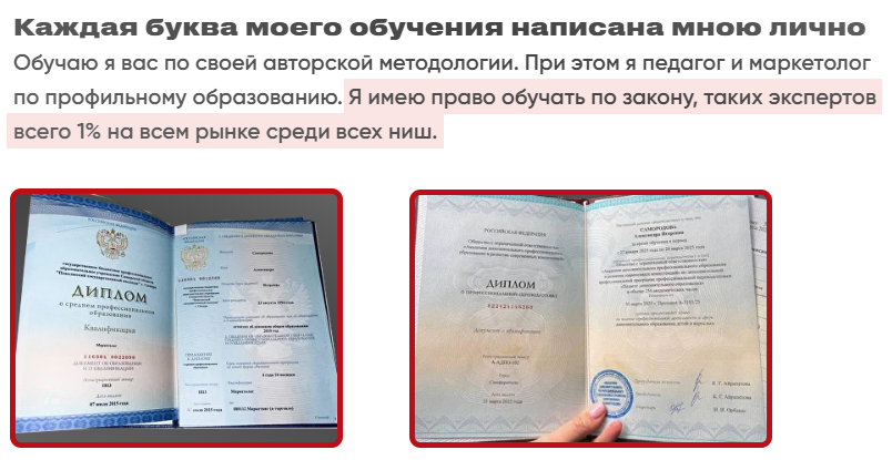 В Интернете минимум информации о наставнике, неизвестно какой путь прошла девушка, какими скиллами обладает. В одном из постов Александра Самородова опубликовала диплом профпереподготовки, подтверждающий ее право проводить обучение взрослых и детей.