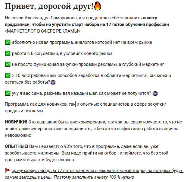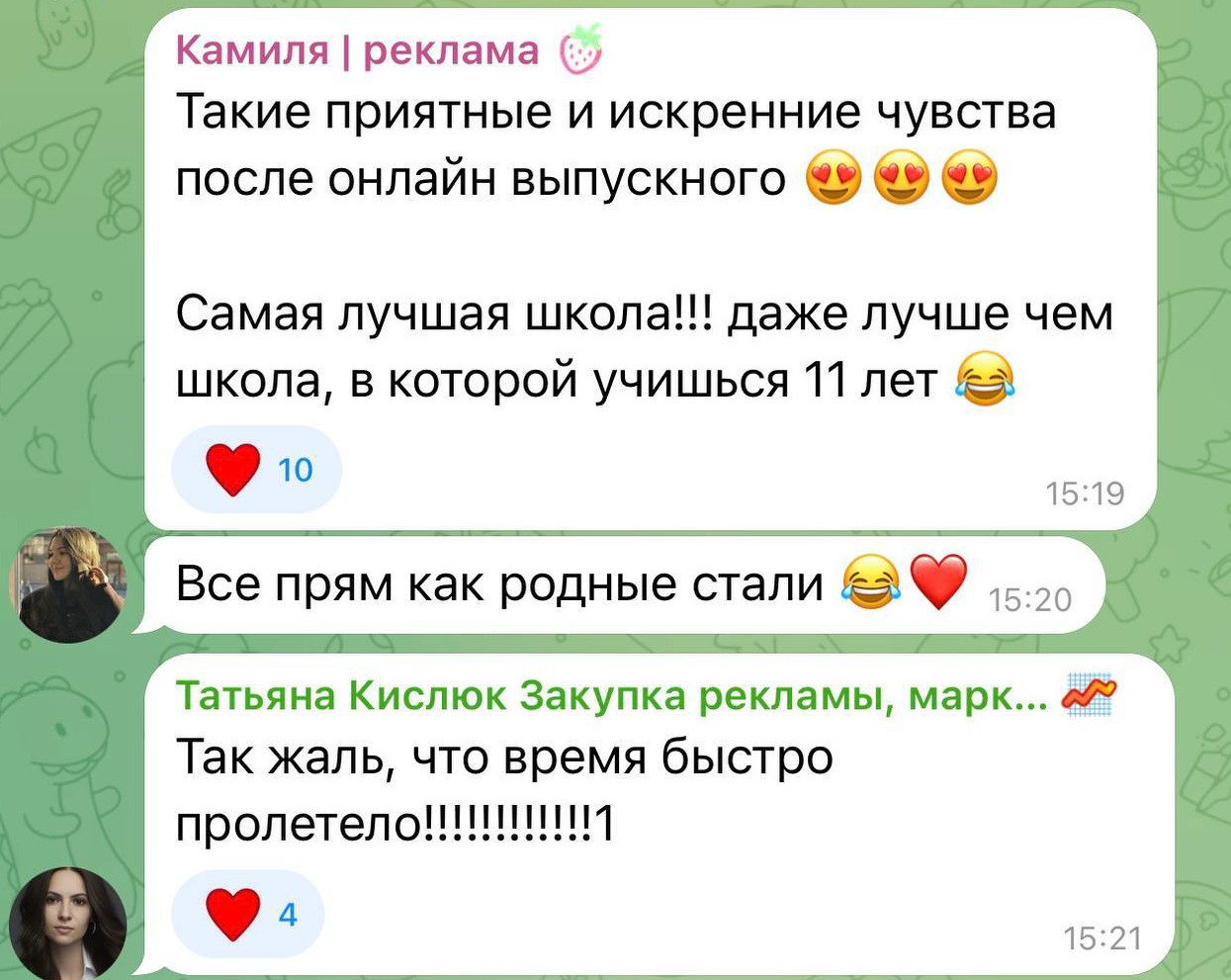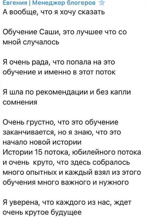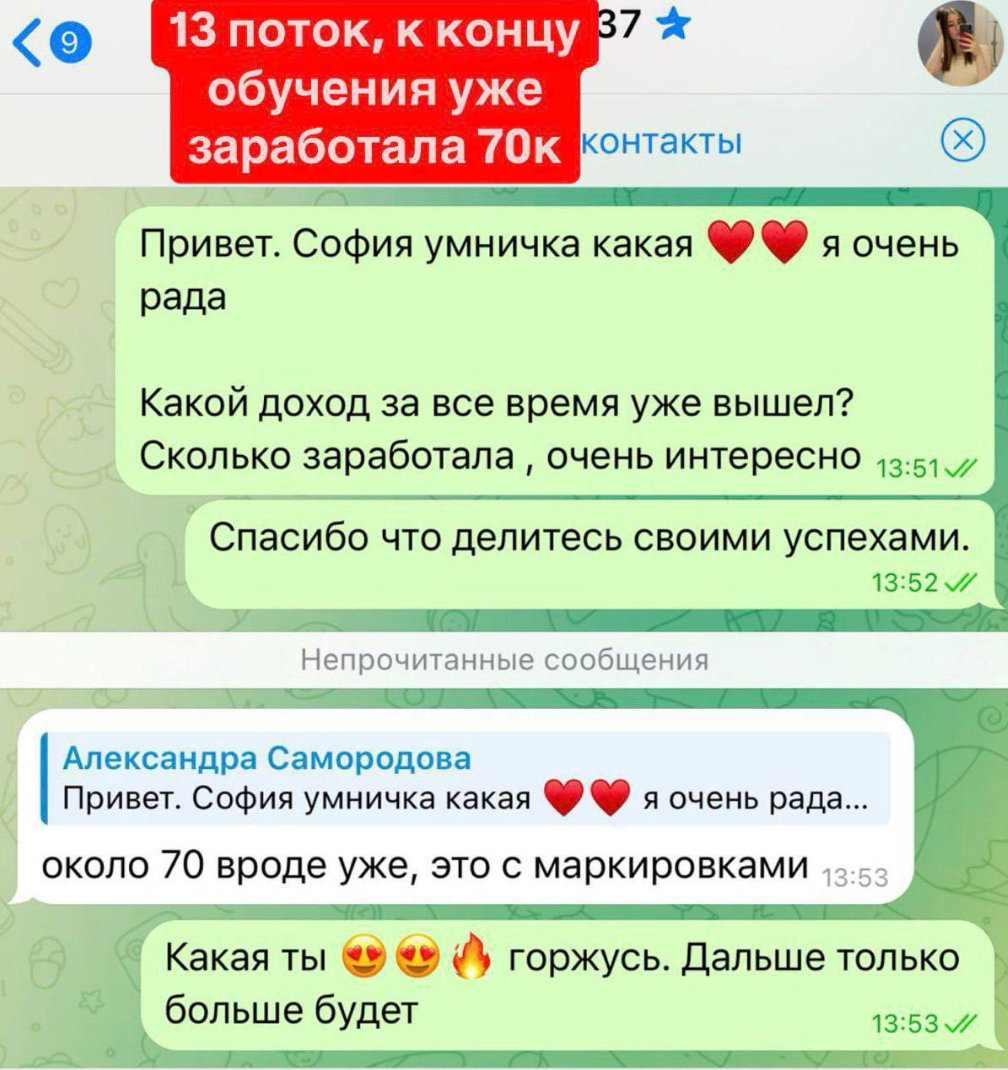 В телеграмм-канале Александры Самородовой есть отзывы, в которых выпускники делятся положительным опытом сотрудничества, довольны качеством курсов. Одной из учениц якобы удалось заработать на маркетинге ₽70,000.