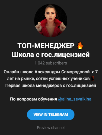 На первую половину 2026 года у наставника есть телеграмм-канал «Топ-менеджер | Школа с гос.лицензий» на 1042 подписчика. В описании платформы Александра Самородова заявляет о 7-летнем опыте продажи курсов.