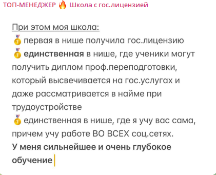 Девушка говорит об уникальных компетенциях и официальном разрешении на работу. Для создания и преподавания курсов она якобы не привлекает экспертов/кураторов.
