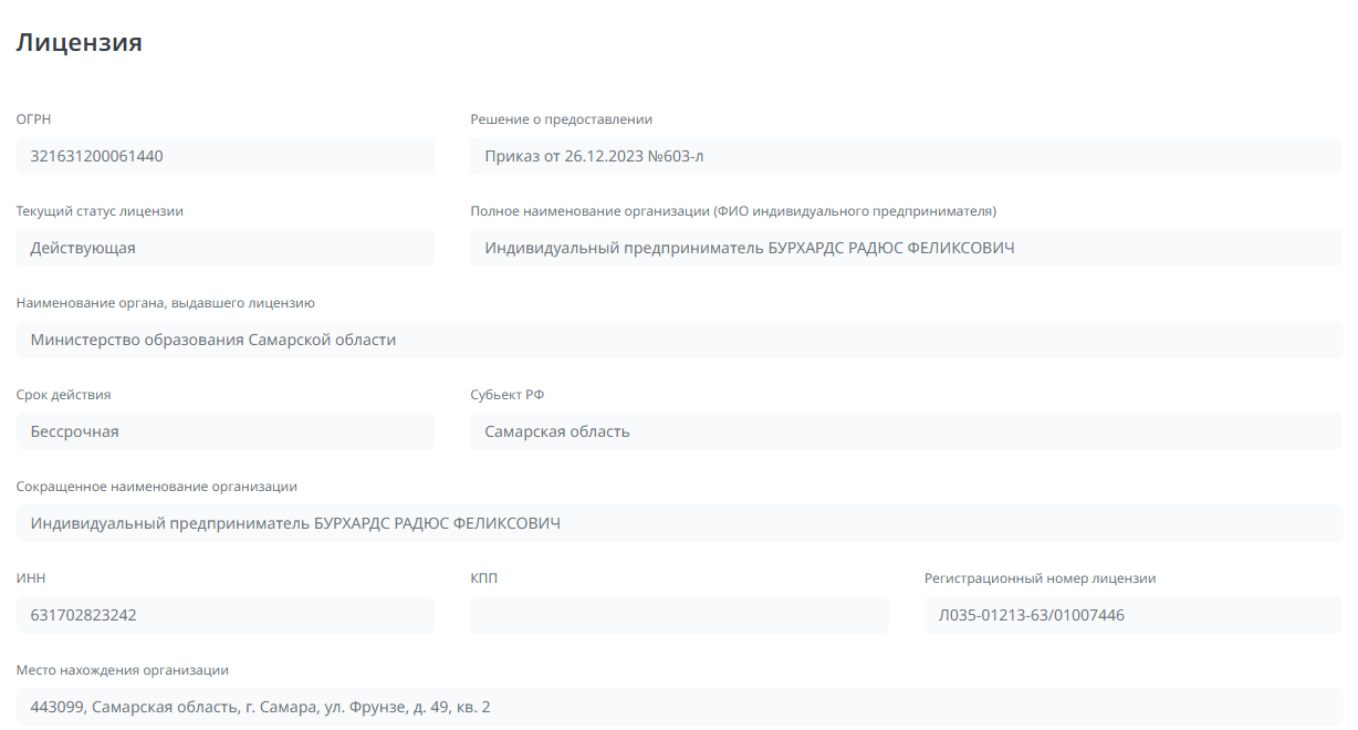 Официальный статус Александры Самородовой не гарантирует ученикам интересный материал и хорошее обучение, но позволяет работать в рамках действующего в РФ законодательства.