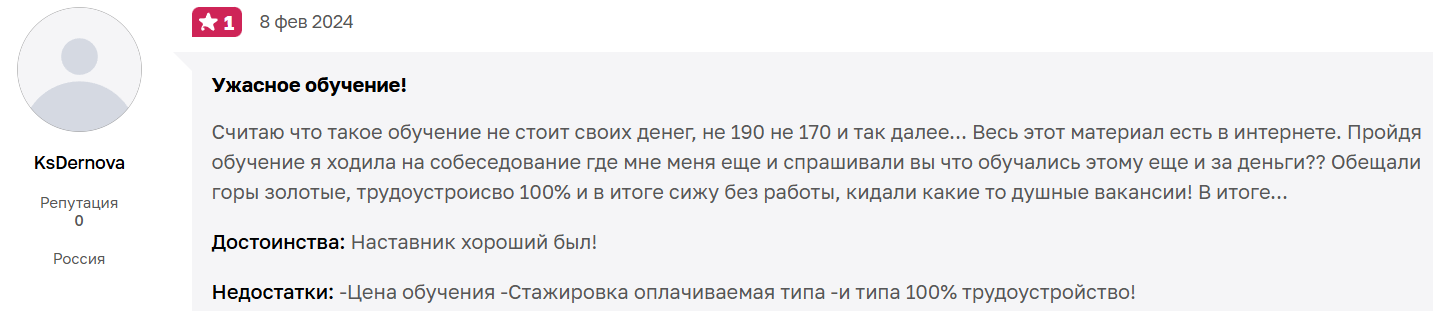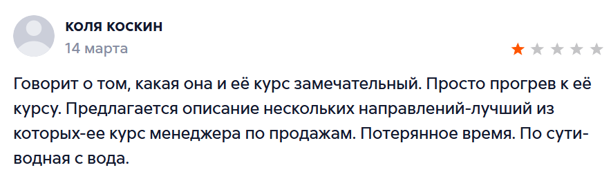 Следующий клиент называет обучение ужасным. Мошенница рассказывает людям ту информацию, которая и так есть бесплатно в интернете.