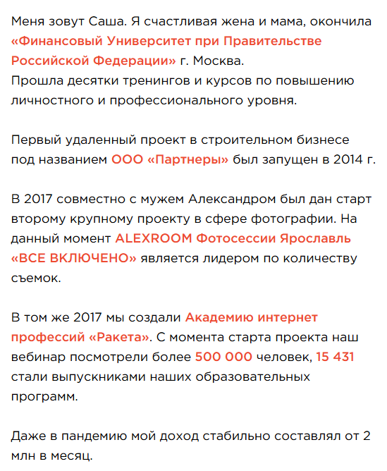 Имя Александры почти не упоминают на сайтах, которые не принадлежат ей самой. Это признак «дутого» эксперта. Девушка якобы запустила несколько успешных стартапов и зарабатывает до 2 млн руб. в месяц, но эта информация ничем не подтверждена и не заслуживает доверия.