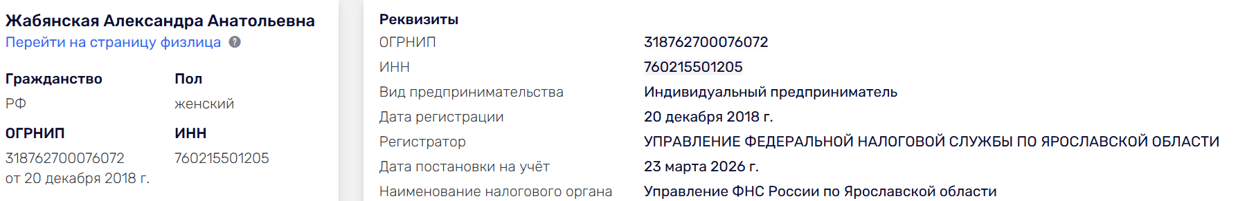 Саша зарегистрирована в качестве ИП в марте 2026 года, то есть буквально «вчера». Ее компания — крайне подозрительная однодневка, у нее отсутствует лицензия на образовательную деятельность. Качество знаний, которые она дает студентам, никто не проверял.