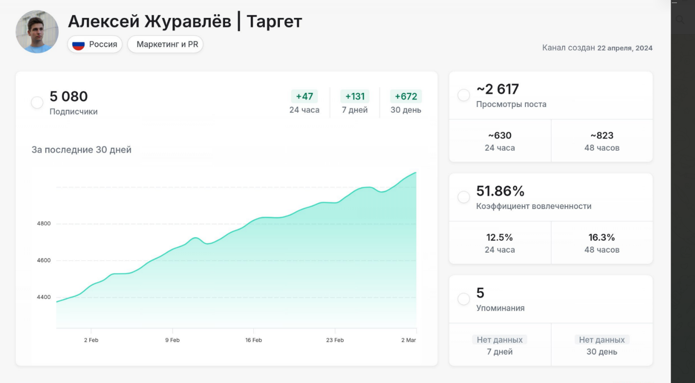 Раскрутку проекта в ТГ начали в феврале 2026 года. Это показалось странным, так как опытный таргетолог обучает студентов уже два года и ТГ канал зарегистрировал 2 апреле 2024 года.
