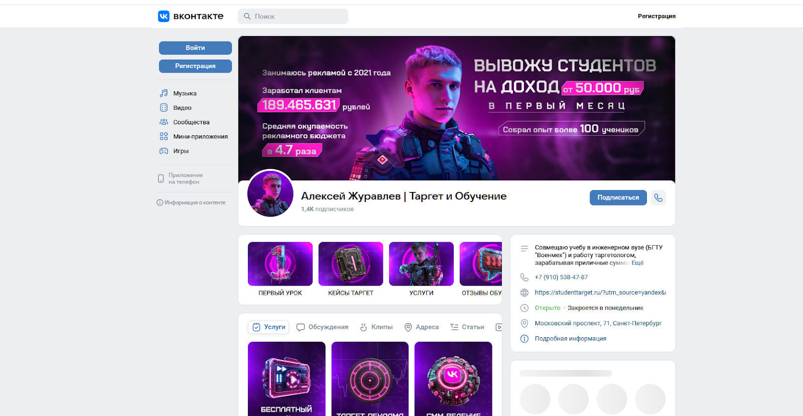 На сайте академии Studenttarget, созданном в 2025 году, не представлена программа обучения, нет графика тренингов. Преподаватель просто предлагает находить клиентов, которым нужна реклама и раскручивать их товар или услуги.
