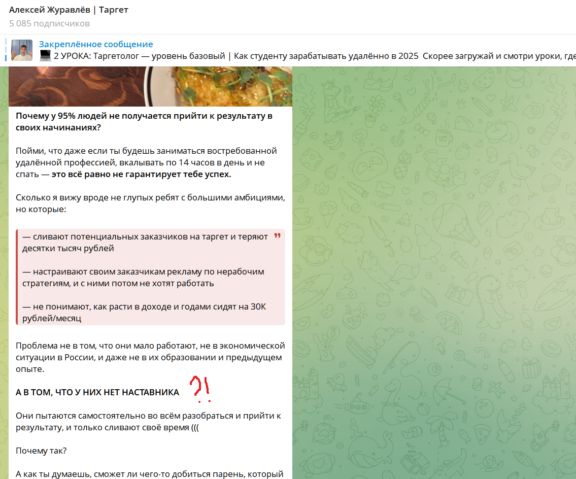 Конкретики про обучение таргету, маркетингу, рекламе в постах ТГ канала также найти не удалось. Алексей предлагает всем развлекаться и общаться. Публикует мотивационные посты. Сообщает, что сейчас находится в Турции и ведет беседы с подписчиками на отвлеченные темы.