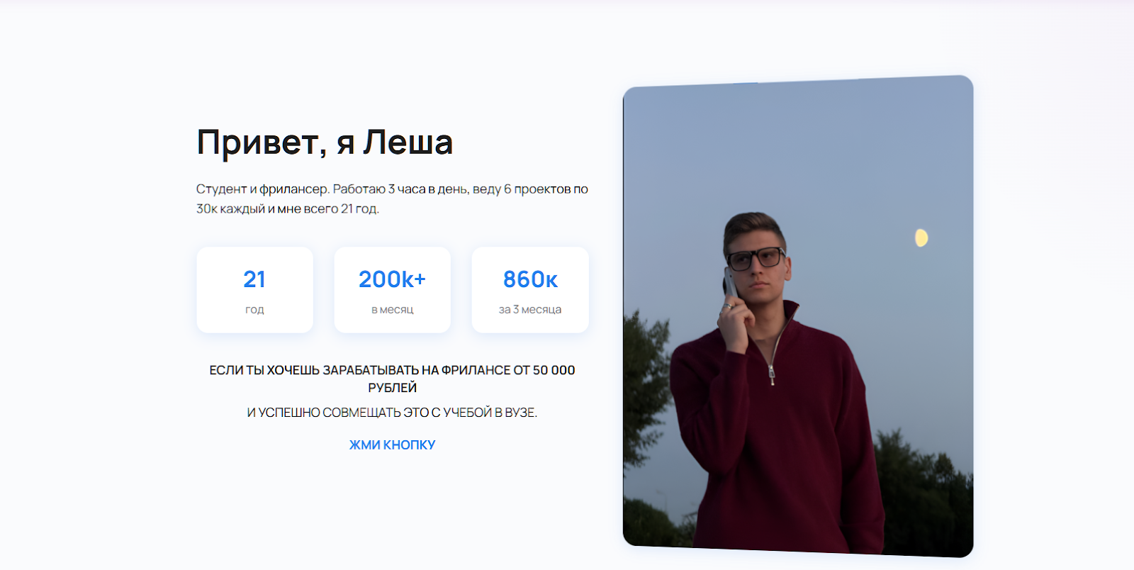 По легенде талантливого специалиста маркетинга и рекламы, ему удалось успешно объединить обучение в военной академии с рекламной деятельностью. Опытный специалист, которому 21 год, более 4 лет занимается рекламой и маркетингом. Уделяет работе всего 4 часа в день и успевает зарабатывать более 200 000 рублей в месяц.
