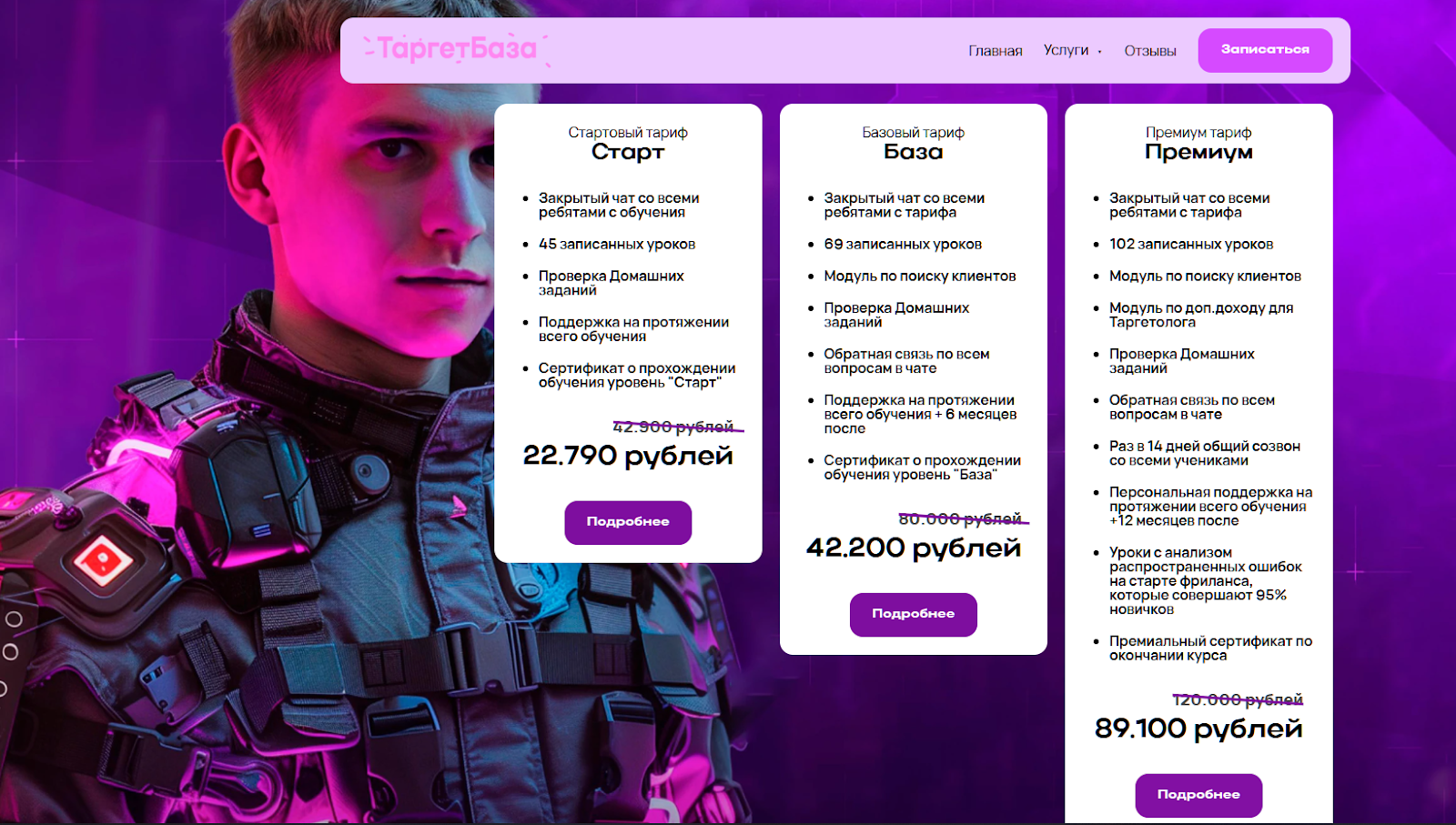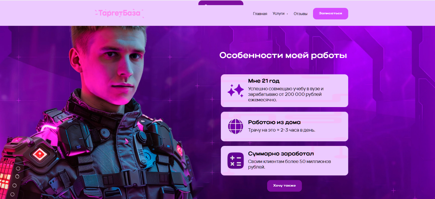 Кроме академии Studenttarget Журавлев создал сайт «Таргет База». На этом сайте предложения ничем не отличаются. Всех желающих пройти обучение перенаправляют в ТГ бот наставника. Но на этом сайте удалось узнать стоимость и примерную программу обучения.