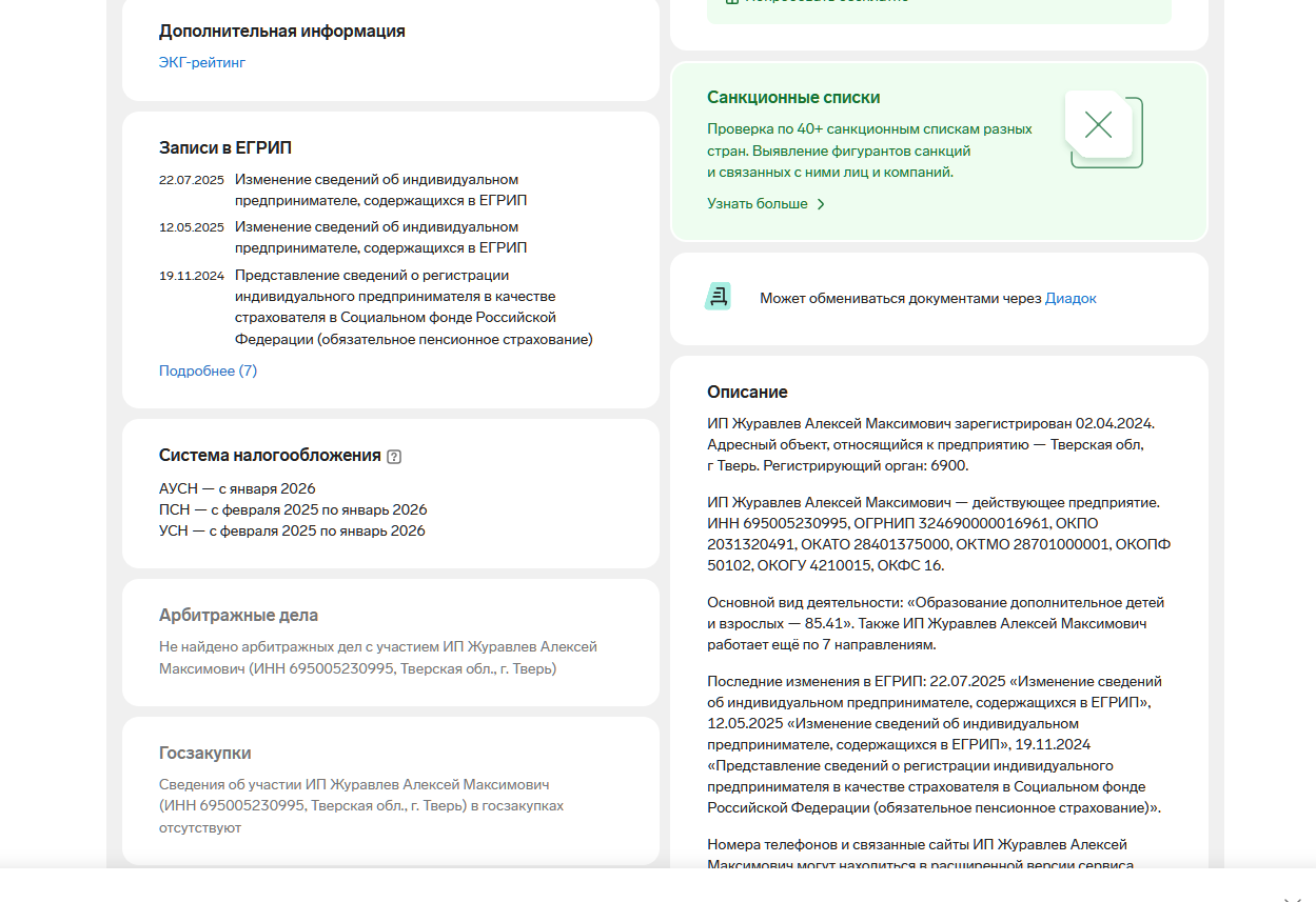 Единственный плюс академии – наличие официально зарегистрированного ИП в Твери. Но проверить возраст ИП Журавлева по налоговым выпискам невозможно. Есть высокая вероятность, что на сайте академии даны произвольные данные о регистрации, взятые из открытых данных в сети.