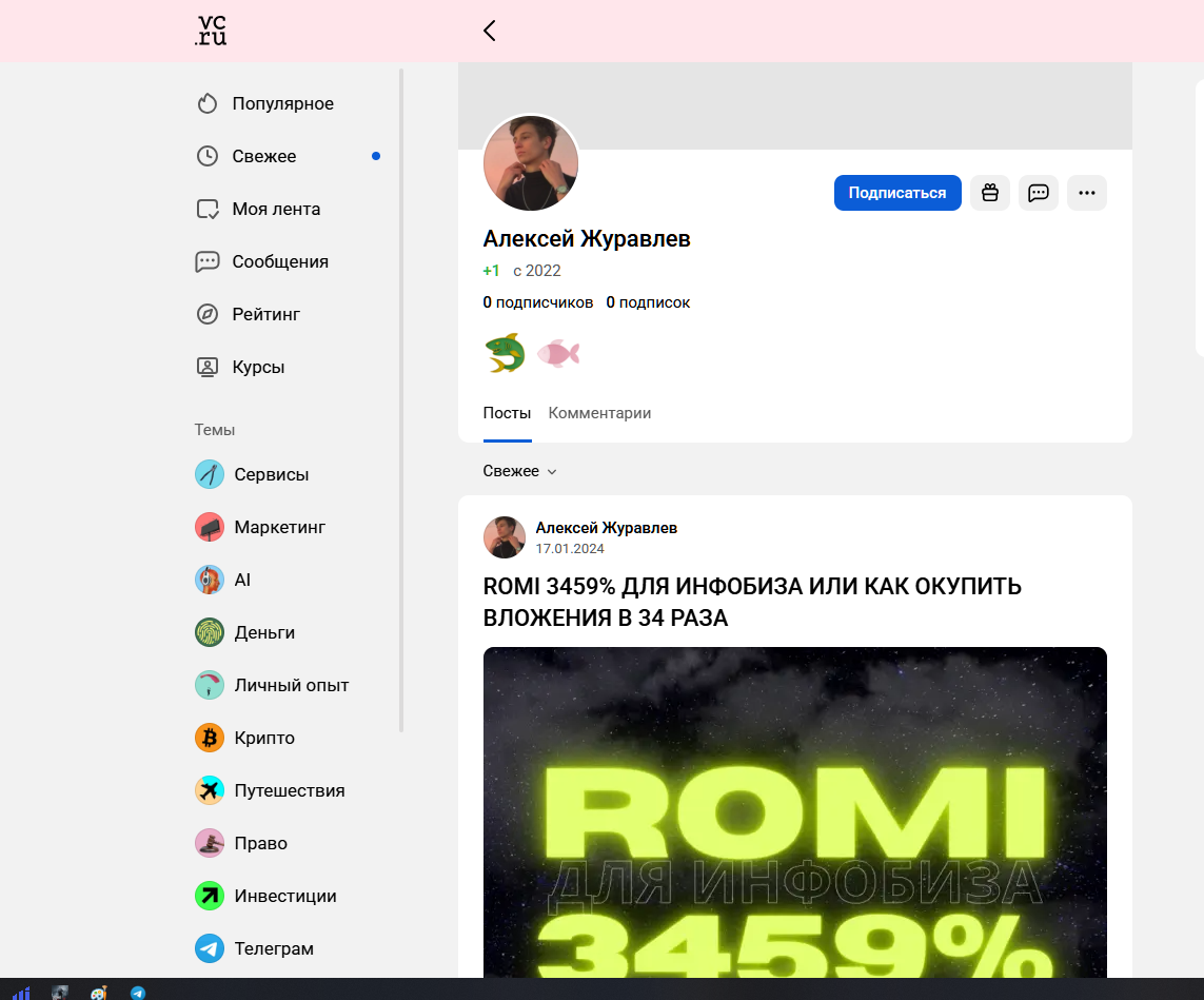 Интересно, что второй аккаунт Журавлева в VC с мудрыми мыслями про таргетирование рекламы и раскрутку сайтов имеет ноль подписок и комментариев.