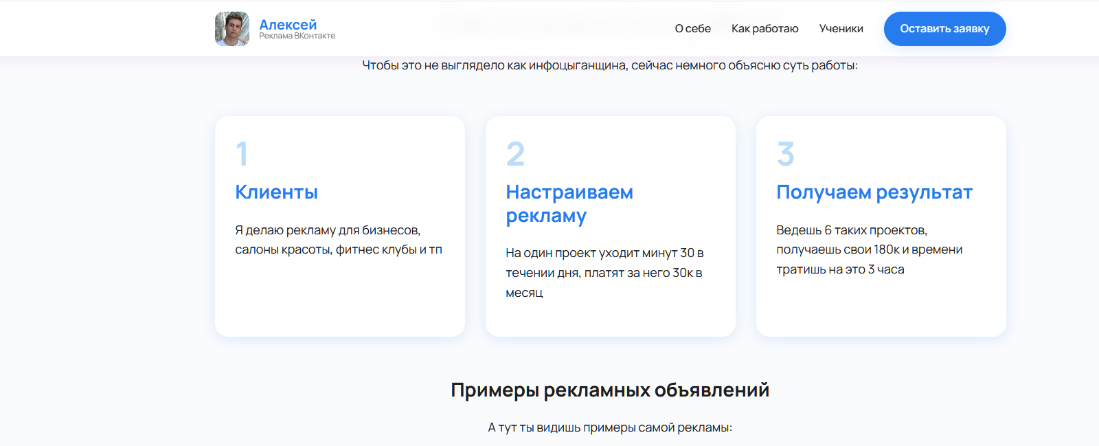 Нет никакой информации про успешные рекламные кейсы наставника. Студентам тренингов не объясняют, где им после обучения искать клиентов. Но, в качестве рекламной «морковки» обещают выдать базу данных заказчиков всего за 50 000 – 60 000 рублей.