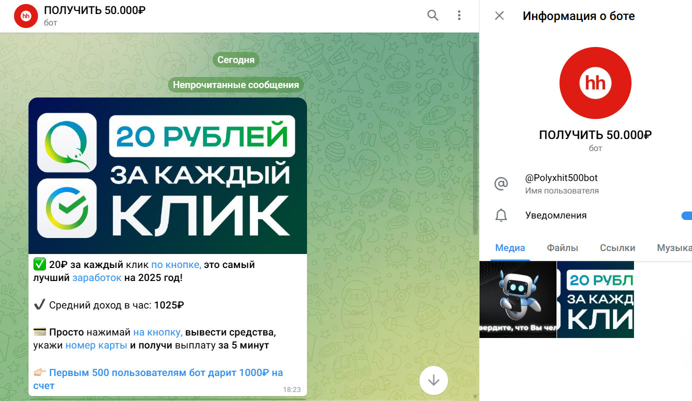Пока инфоцыган Александр Круглов манипулирует вниманием подписчиков на канале, его бот присылает сообщения вступившим в закрытый паблик. Здесь та же кухня с легким заработком, но под другим соусом. Деньги, согласно предложению бота, копятся при нажатии на кнопку. В проект приплели известные логотипы – Сбера и площадки HH ru. В боте есть еще одна ссылка на другой проект Удаленщик c фейковыми вакансиями и сомнительными инвестиционными офферами. Как видим, канал Александра – лишь часть звена в длинной цепочке площадок аферистов.