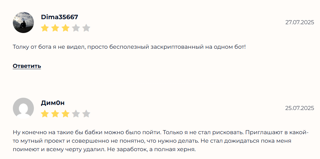Отзывы про Телеграмм сообщество Александр Круглов private отсутствуют, но пользователи ясно высказываются, что продвигаемый бот мошенник, а Александр Круглов явно связан с ним напрямую и получает либо комиссии от проекта, или же является его учредителем.