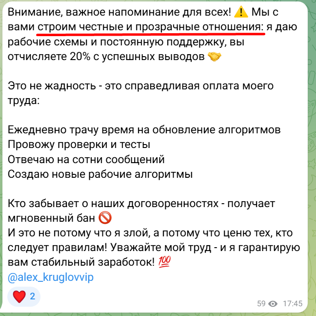 Мошенник лжет не краснея, убеждая публику в “честных и прозрачных” отношениях. Якобы он берет свои 20% с успешных выигрышей в качестве “справедливой оплаты труда”, только вот справедливости от предложенной схемы ждать не стоит.