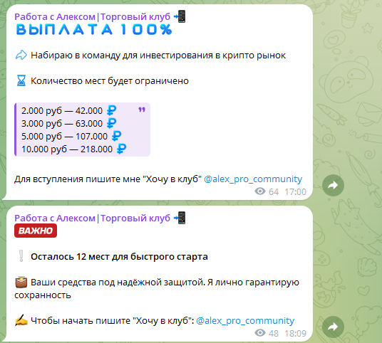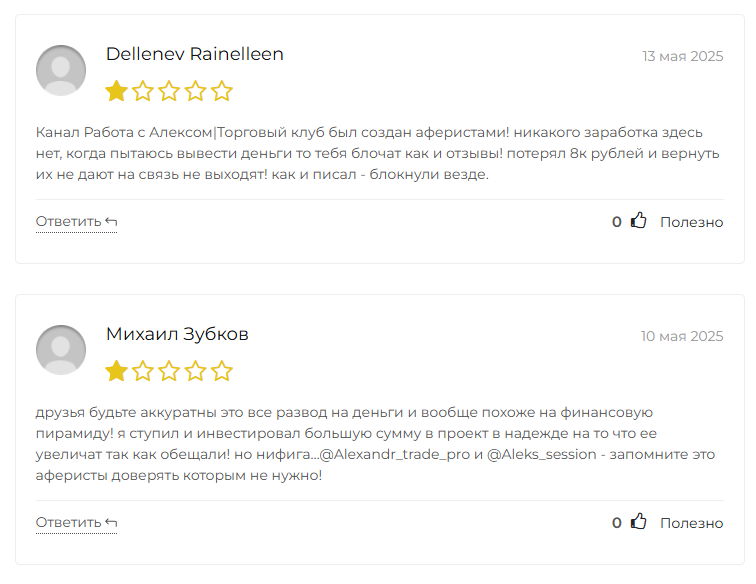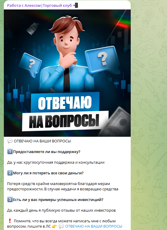 О канале «Работа с Алексом | Торговый клуб» отзывы встречаются в основном отрицательные, что показательно говорит о репутации проекта. Речь о телеграмм-канале трейдера, который предлагает заработать, покупая и продавая активы – по сути, речь о стандартной раскрутке депозита.