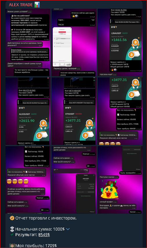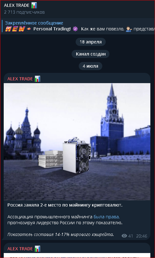 Alex Trade – Телеграм-канал, на котором пользователям обещали простой и быстрый заработок с помощью инвестиций в криптовалюты. Руководил сообществом некий пользователей, который представлялся Александром (tradealexand). Он предлагал просто невероятную прибыль для каждого инвестора. Но, как правило, подобные проекты ведут мошенники. В связи с этим проект Alex Trade отзывы в сети собрал негативные и был закрыт. Разберем работу канала, чтобы выяснить, каким образом автор пытался обманывать аудиторию.