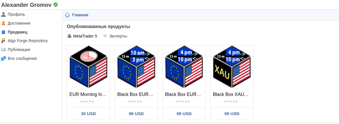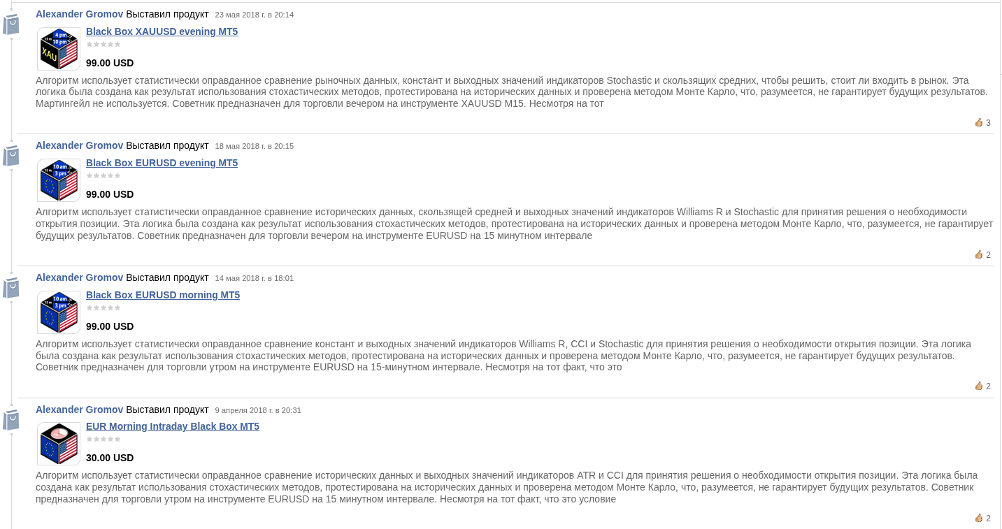 В арсенале вендора Alexander Gromov есть несколько советников, например, Black Box EURUSD. Само название «Черный ящик» для опытного алготрейдера звучит как издевательство. Автор буквально говорит: «дай денег и не спрашивай, как это работает». Ценники варьируются от 30 до 99 долларов — подозрительно дешево для действительно полезного софта, способного генерировать альфу.