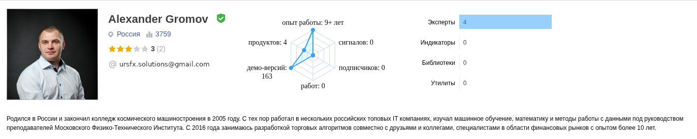 Легенда у персонажа продумана с характерным для инфобизнеса размахом. Трейдер Александр Громов зарегистрирован на Mql5 Com под ником @alex grom. Он утверждает, что окончил колледж космического машиностроения и успел поработать в топовых IT-компаниях. Звучит солидно, но на деле — это всего лишь «продающий текст» без пруфов. Ссылок на профили в LinkedIn, названий фирм или подтвержденных дипломов нет.