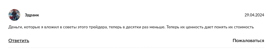 Очередной «гуру» трейдинга, обещающий золотые горы за баснословные суммы. Курсы по цене от 70 тысяч до 4 миллионов рублей, а гарантий — ноль. Сертификаты есть, а реальных кейсов нет. Похоже на очередной развод для доверчивых новичков.