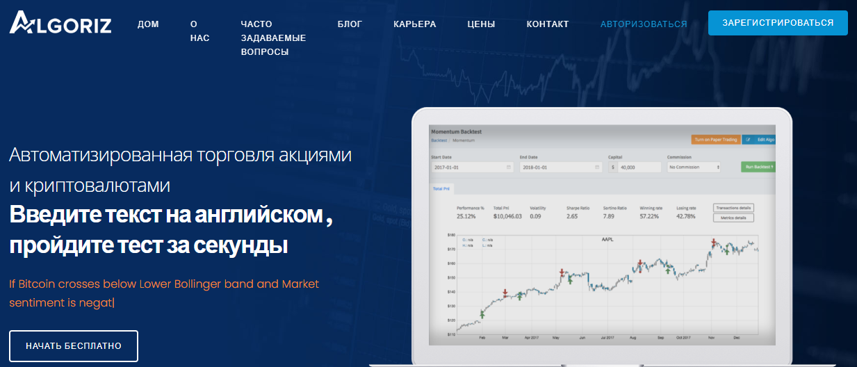 Algoriz – это решение для торговли акциями и криптой. Создано американской командой разработчиков, имеющих опыт работы в Goldman Sachs и Millennium. AI-алгоритм встроен в торговую систему. Бот создает стратегии на основе текстового описания. Затем тестирует их сразу и корректирует.