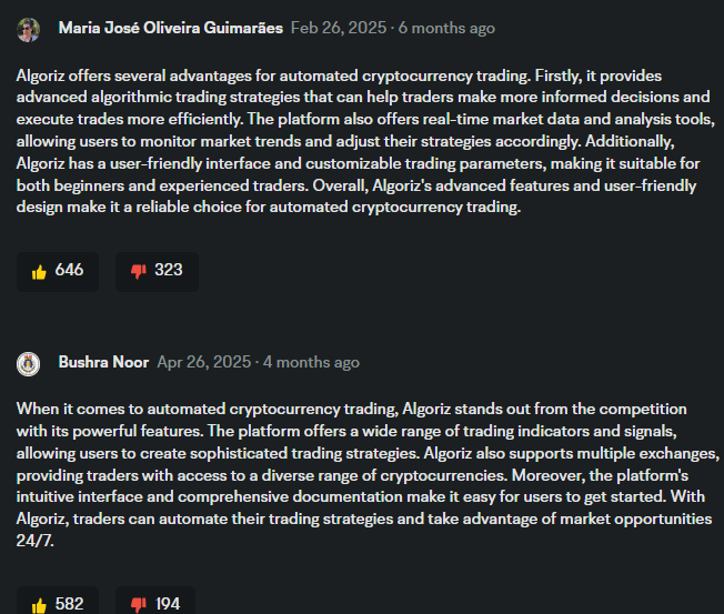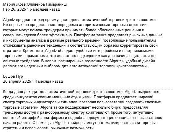 То есть, англоговорящие пользователи высоко оценили функционал платформы. Они отмечают в комментариях точность и гибкость, которые Algoriz предоставляет трейдерам для внедрения автоматизированных торговых систем.