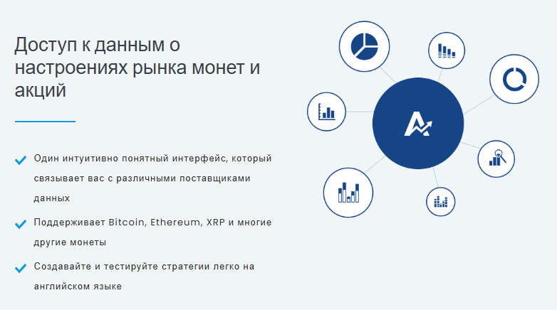 Кроме того, вы получите с его помощью доступ к аналитике рыночных настроений по разным цифровым монетам или акциям через один интерфейс. Причем можно подключиться к нескольким поставщикам данных.
