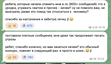 Но через несколько минут автор выкладывал сообщение о том, что ему написали более 800 сообщений, стали спамить и угрожать, поэтому сообщения теперь платные.