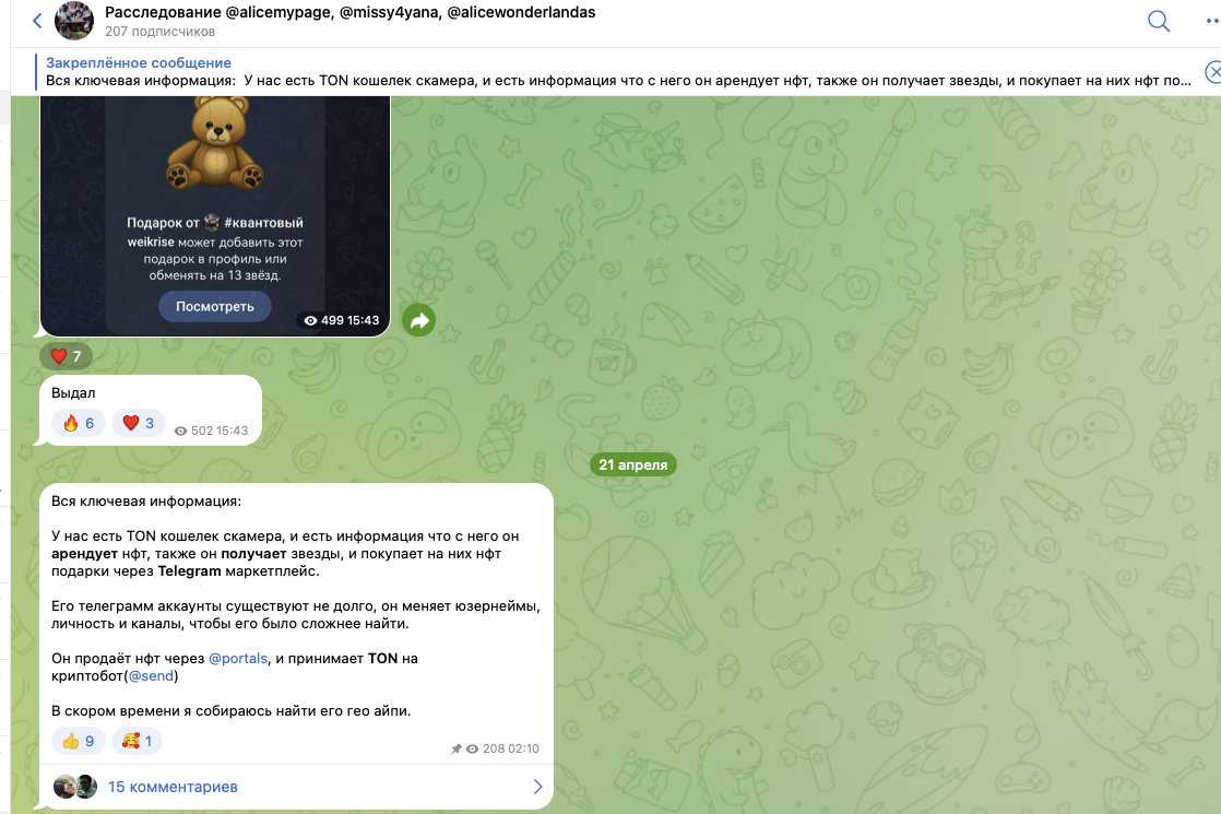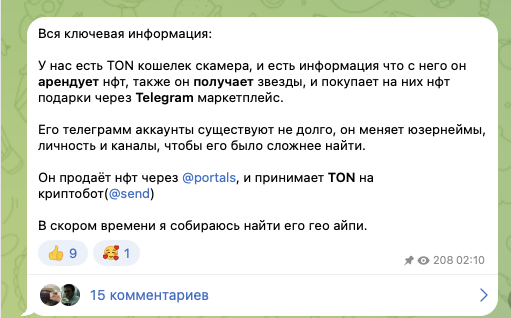 После этого мошенник покупал на звезды Тг-гифты, продавал их за ТОН и выводил на свой кошелек. После этого аккаунт просто удалялся вместе с Телеграм-каналом.