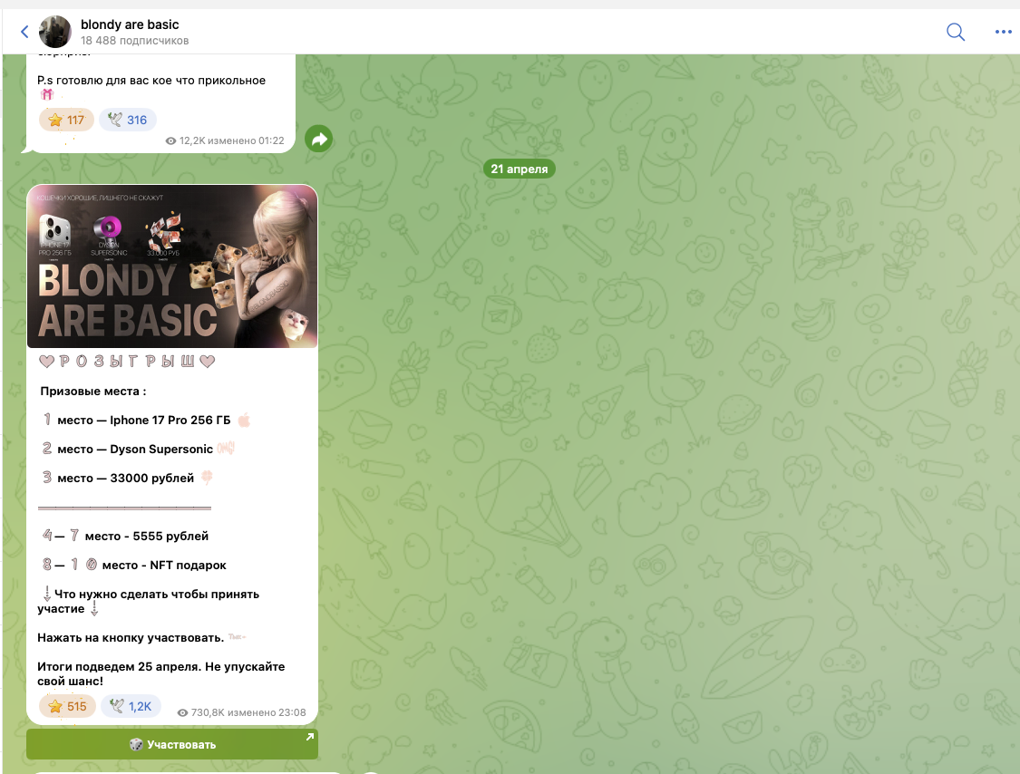 Сообщество мошенника alicewonderlandas было удалено вместе с юзером в середине апреля 2026 года. Уже это дает достаточно понятный ответ на вопрос, является ли обманом розыгрыш от https t me aliceadventuree.