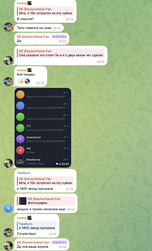 В результате автор задавал вопросы о том, куда и как переводить, говорил, что так не получилось, нужны другие реквизиты. Таким образом он просто разводил человека на новые и новые сообщения, которые приносили скамеру по 480 звезд.