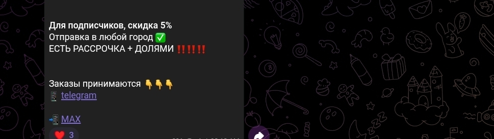 Рассрочка и оплата долями тоже вызывают вопросы. Ни условий рассрочки, ни партнера, через которого она оформляется, в канале не раскрывается. Упоминание «есть рассрочка» без деталей — это либо оплата частями напрямую (то есть фактически предоплата), либо оформление через сторонний сервис, о котором клиент узнает уже в процессе. В обоих случаях риски несет покупатель.
