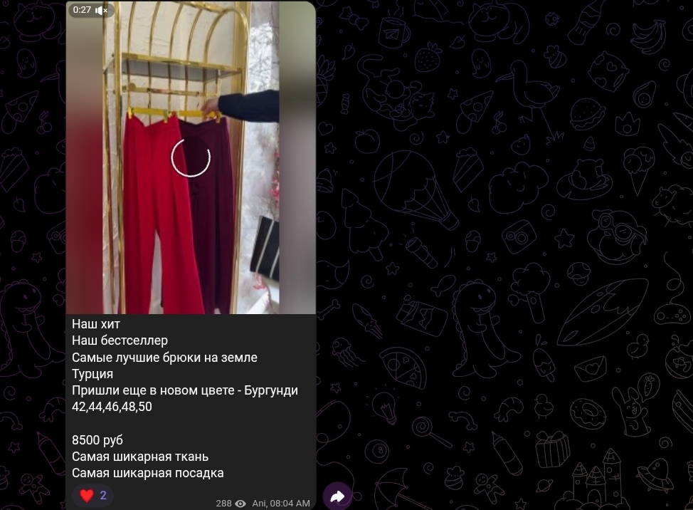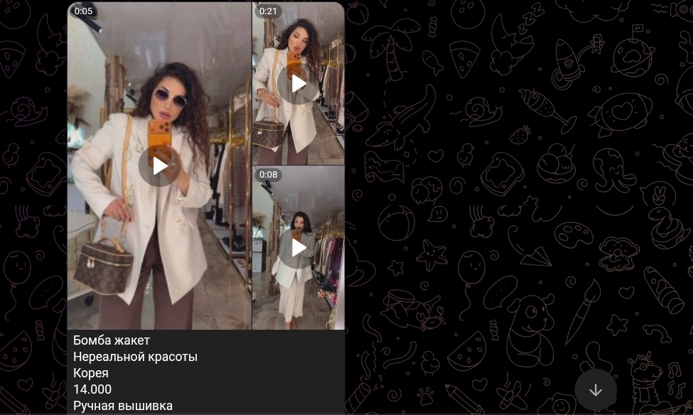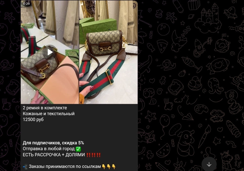 Отдельного внимания заслуживает раздел сумок. В канале демонстрируется сумка в характерном узнаваемом дизайне с логотипом известного люксового бренда — и стоит она 12 500 рублей. Оригинальные изделия этого бренда стоят от нескольких тысяч долларов. Продажа реплик под видом товара без прямого указания «под бренд» — это юридически спорная зона, которая при возникновении претензий ставит покупателя в уязвимое положение: ни возврата по закону о защите прав потребителей, ни каких-либо гарантий.
