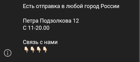 Торговая деятельность в России обязывает продавца регистрироваться как минимум как индивидуальный предприниматель. Никаких данных о юридическом лице, ИНН, статусе ИП или ООО в канале нет. Адрес физической точки есть, а вот кто является её владельцем по документам — неизвестно. При такой схеме работы в случае спора покупатель не знает, к кому обращаться официально.