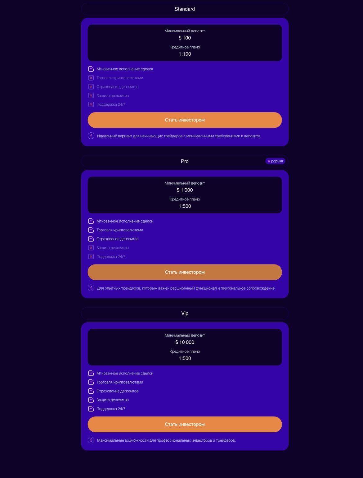 - Standart: 100$. Минимальный порог входа, базовое исполнение ордеров, ограниченный набор инструментов;