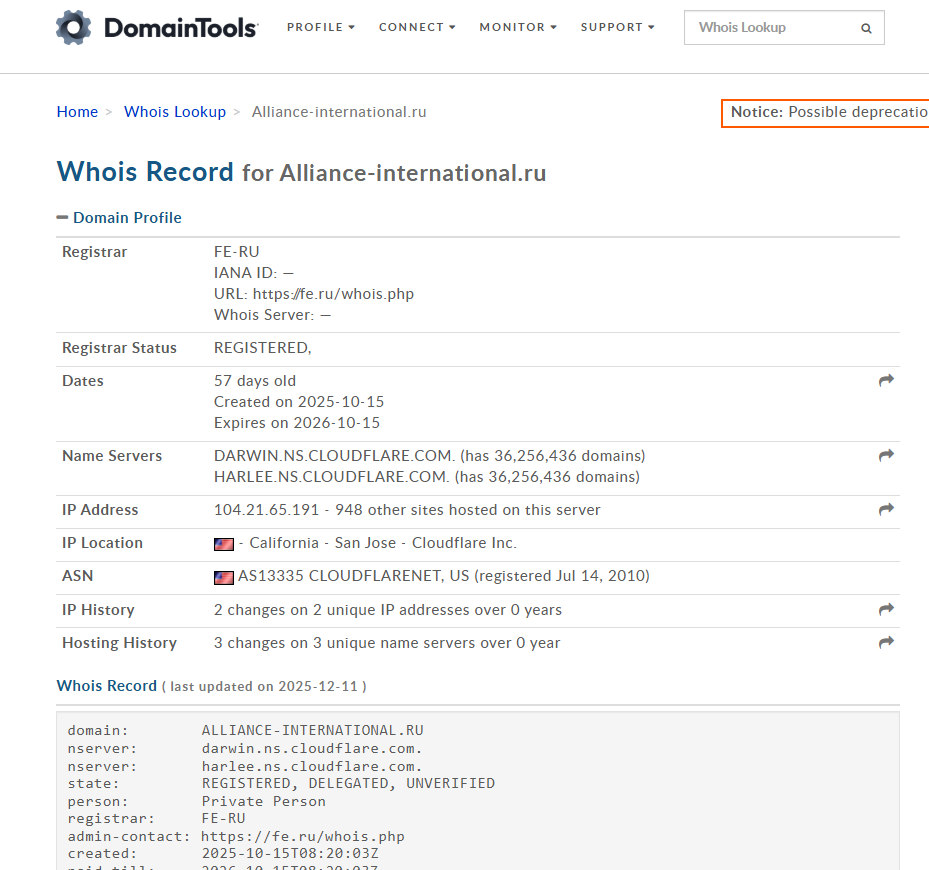 Alliance International Ru имеет домен, который зарегистрирован 15 октября 2025 года. Это делает платформу очень молодой. Всего около двух месяцев на середину декабря 2025 года. Контактные данные ограничены поддержкой через Telegram.